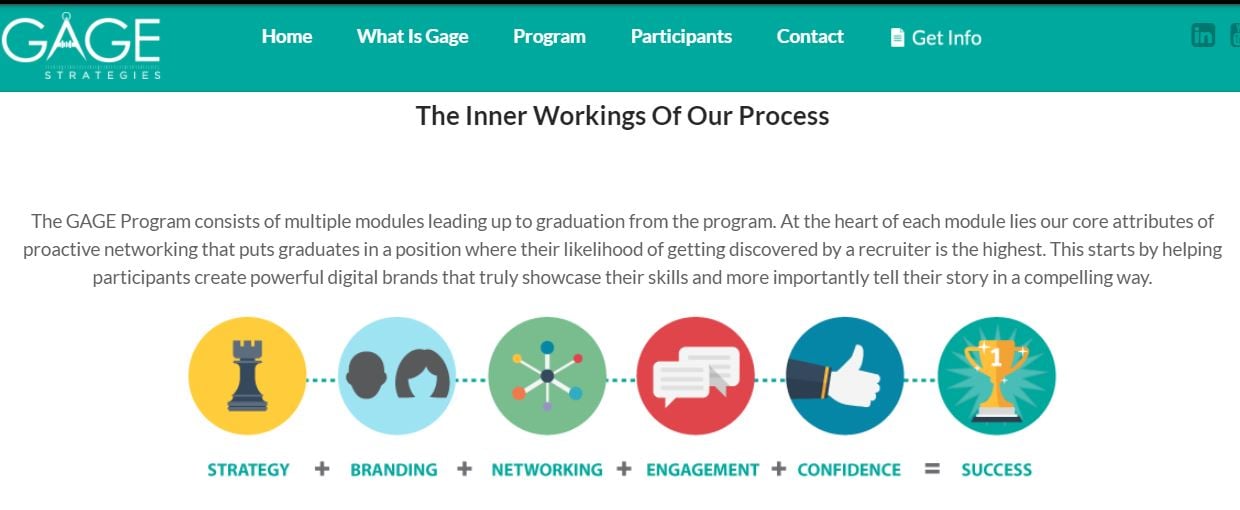 Gage Strategies’ purpose was to teach college students and recent graduates how to burnish their professional image and marketability. Modules of the training program included headings like “strategy,” “branding,” “networking,” and “confidence.”