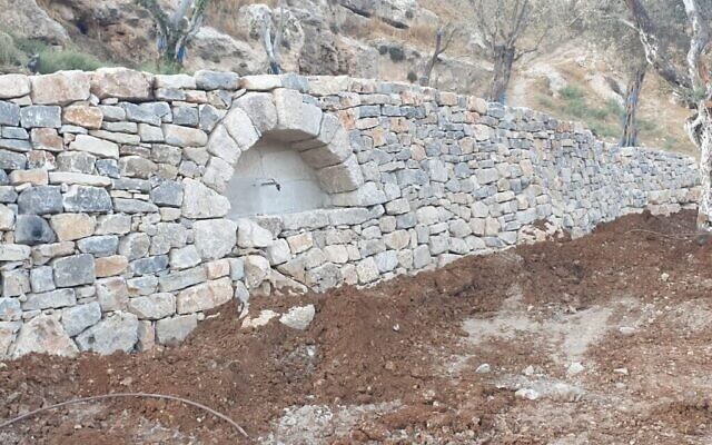 On the other side of the valley road, close to where the Somrin family also grows olive trees, landscaping orders were not needed. There, more extensive and apparently permanent work has been carried out, including new terraces supported by new walls decorated with niches whose function is not immediately clear. The work was done with the approval of the Custodian of Absentee Property, a government department that regulates the treatment of absentee Palestinians’ property, though there is also an appeal pending.