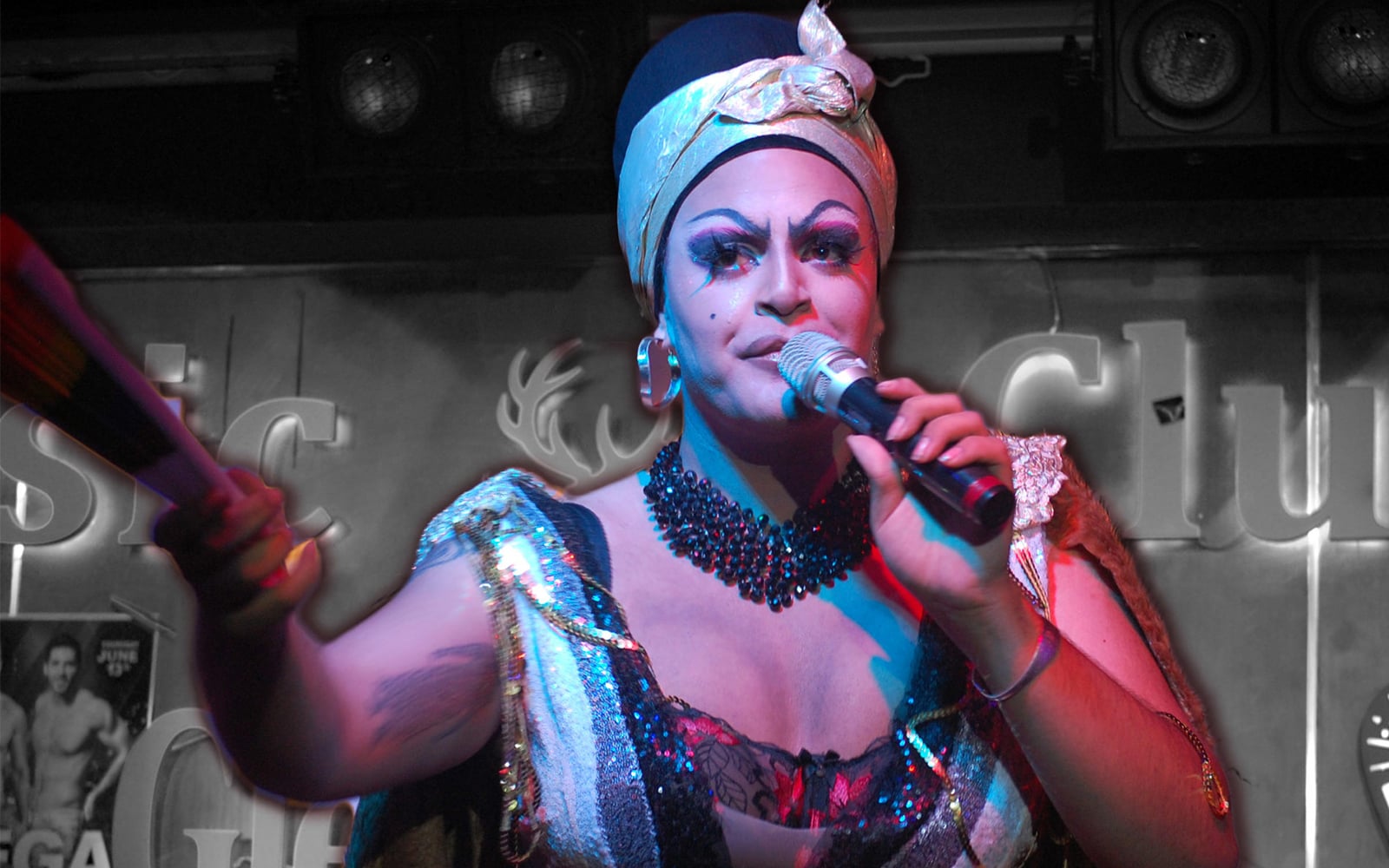 Onto the small stage strides a busty woman, her lips defined by serious black lipstick and hair concealed by a luminescent headscarf. She is dressed as a parody of a Hasidic man, wearing a long black coat over her frock and a top hat perched atop her kerchief-covered hair.